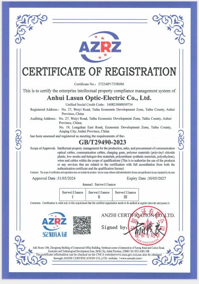 2024年5月31日,安徽深联光电股份有限公司,荣获企业知识产权合规管理体系认证证书!经现场评审,满足GB/T29490-2023标准。认证范围包括:通信光缆、通信电缆、充电枪、高分子材料(聚氯乙烯塑料、低烟无卤料、聚氨脂合成材料、聚乙烯)、资质范围内电线电控的生产、销售及上述活动相关采购的知识产权管理(涉及资质许可的产品/服务,认证证书与资质许可证书同时使用)。