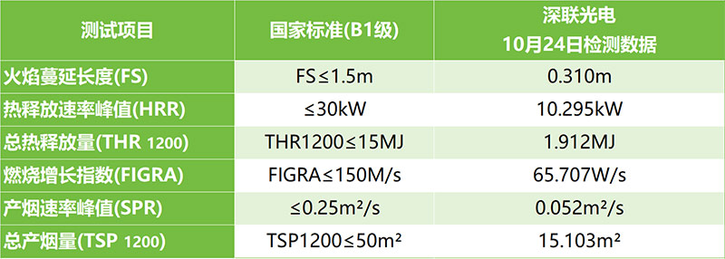深联光电对产品的测试严格依据GB 31247-2014《电缆及光缆燃烧性能分级》标准中关于B1级的要求严格进行,此项测试涉及产品燃烧时的火焰蔓延、热释放、烟密度、烟气毒性、腐蚀性及燃烧滴落物等关键安全指标,测试结果清晰地展示了我们的实测数据优于燃烧性能B1级的要求: