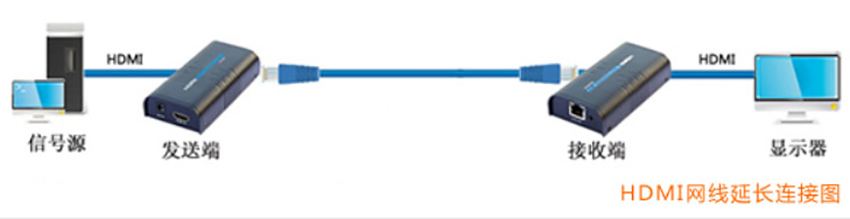 这种情况下如果只是单纯的传输HDMI信号到显示设备上,HDMI信号不经过其他设备的话,我们可以采用网线延长信号的方法,用HDMI网线延长器来将信号延长,HDMI网线延长器分为发送端(HDMI输入,网线输出)和接收端(网线输入,HDMI输出),可以延长100米(5类网线)、120米(6类网线)。